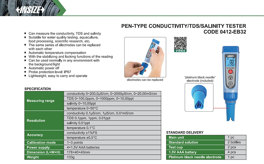 0412-EB32 conductivity/TDS off-line 0~200.0μS/cm, 0~2000μS/cm, 0~20.00mS/cm, 0~100.0ppm, 0~1000ppm, 0~10.00ppt, 0~10.00ppt, 0~50°C no