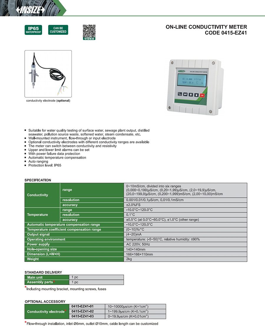 0415-EZ41 conductivity/TDS on-line 0~10mS/cm, divided into six ranges (0.000~0.199)μS/cm, (0.20~1.99)μS/cm, (2.0~19.9)μS/cm, (20.0~199.9)μS/cm, (0.200~1.999)mS/cm, (2.00~10.00)mS/cm, -10.0°C~120.0°C yes
