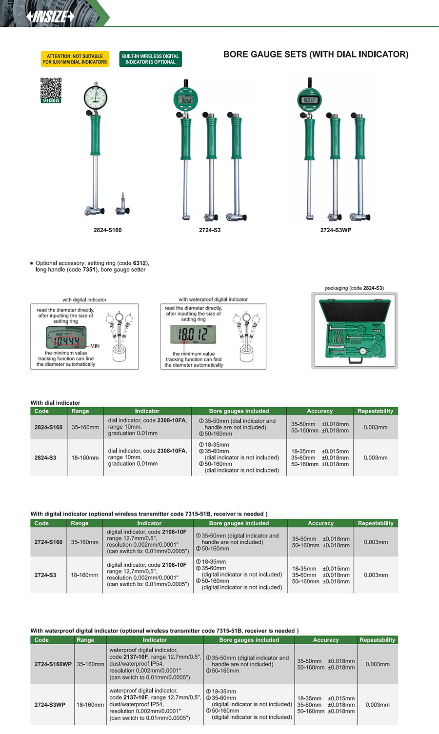 2724-S3 18-160mm 18-35mm, ±0.015mm, 35-60mm, ±0.018mm, 50-160mm, ±0.018mm 0.003mm