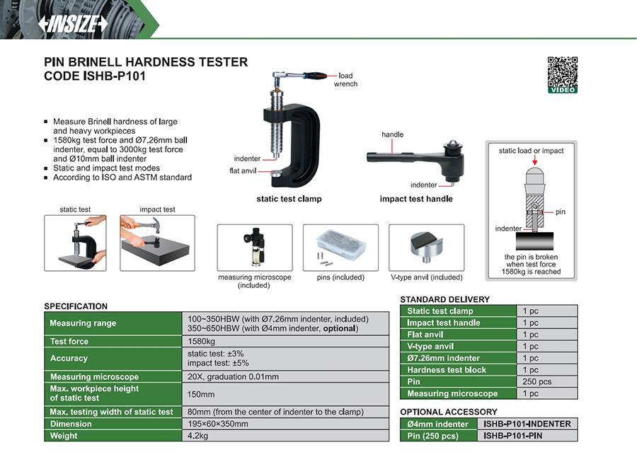 ISHB-P101 100-350HBW (with Ø7.26mm indenter, included) 1580kg 150mm 80mm (from the center of indenter to the clamp)