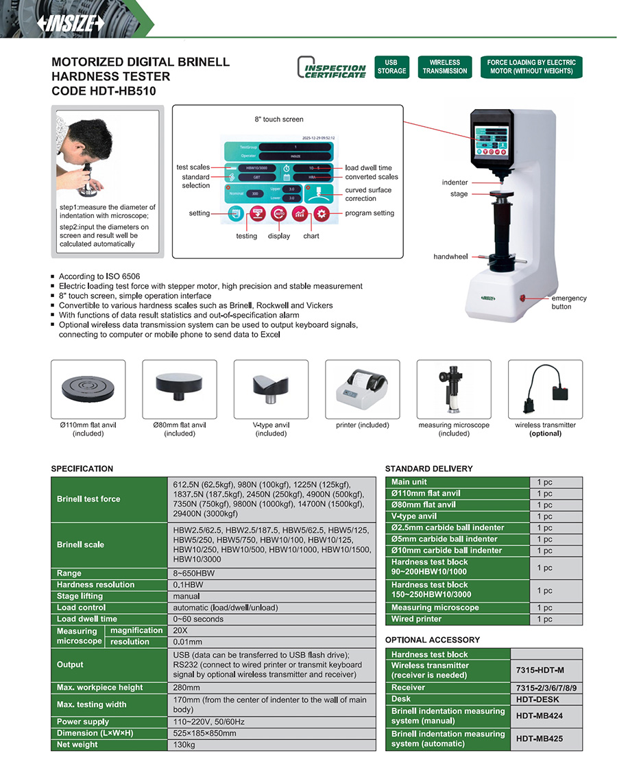 HDT-HB510 62.5kgf, 100kgf, 125kgf, 187.5kgf, 250kgf, 500kgf, 750kgf, 1000kgf, 1500kgf, 3000kgf automatic (load/dwell/unload) 280mm 170mm (from the center of indenter to the wall of main body) HBW2.5/62.5, HBW2.5/187.5, HBW5/62.5, HBW5/125, HBW5/250, HBW5/750, HBW10/100, HBW10/125, HBW10/250, HBW10/500, HBW10/1000, HBW10/1500, HBW10/3000