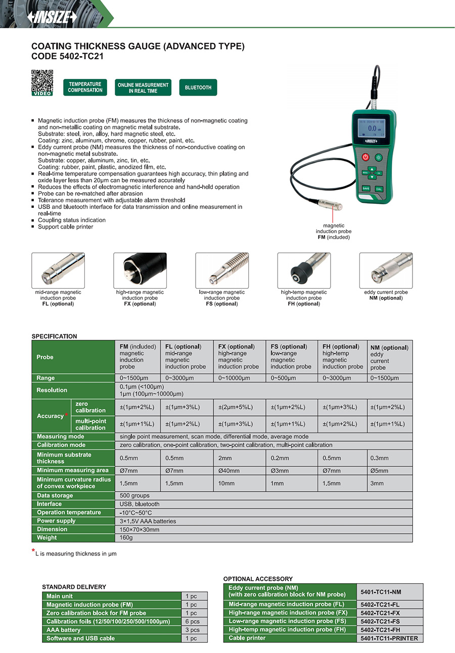 5402-TC21 0~1500μm: FM (included) magnetic induction probe multi-point calibration ±(1μm+1%L) 0.1μm (<100μm), 1μm (100μm~1500μm) USB, bluetooth