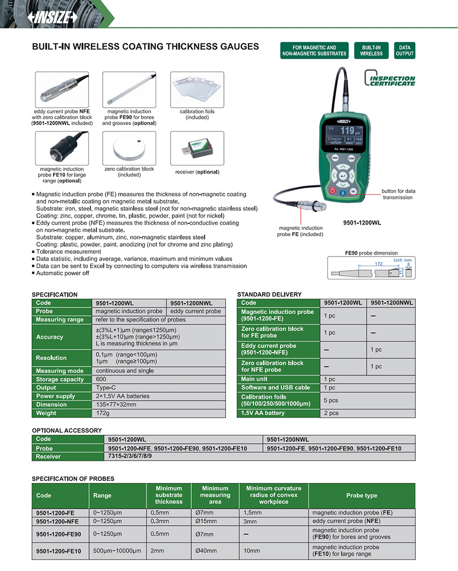 9501-1200WL 0~1250μm ±(3%L+1)μm (range≤1250μm), ±(3%L+10)μm (range>1250μm) 0.1μm (range<100μm), 1μm (range≥100μm) Type-C