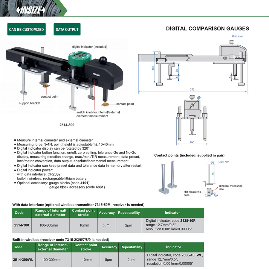 Code Accuracy Repeatability Range of external diameter Range of internal diameter