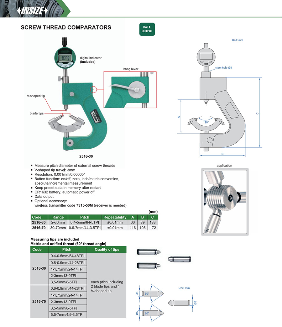 2516-70 30-70mm 0.001mm/0.00005" ±0.01mm 0.6-7mm/44-3.5TPI