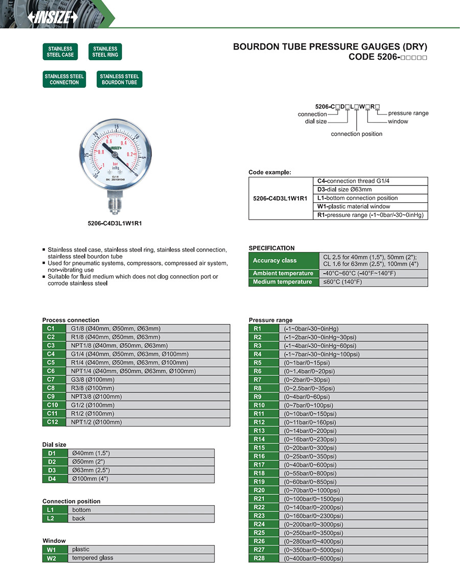 | 5206 | G1/8, R1/8, NPT1/8, G1/4, R1/4, NPT1/4, G3/8, R3/8, NPT3/8, G1/2, R1/2, NPT1/2 | Ø40mm, Ø50mm, Ø63mm, Ø100mm | bottom, back | plastic, tempered glass |