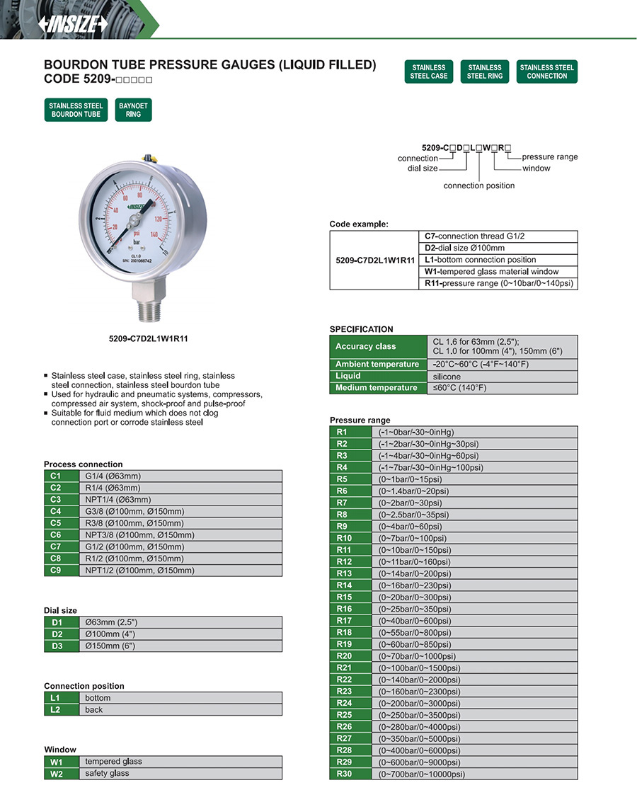| 5209-□□□□□ | G1/4, R1/4, NPT1/4, G3/8, R3/8, NPT3/8, G1/2, R1/2, NPT1/2 | Ø63mm, Ø100mm, Ø150mm | bottom, back | tempered glass, safety glass |