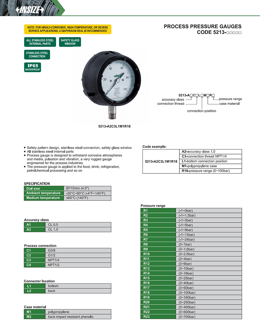 5213-□□□□□ G3/8, G1/2, NPT1/4, NPT1/2 Ø115mm bottom, back safety glass