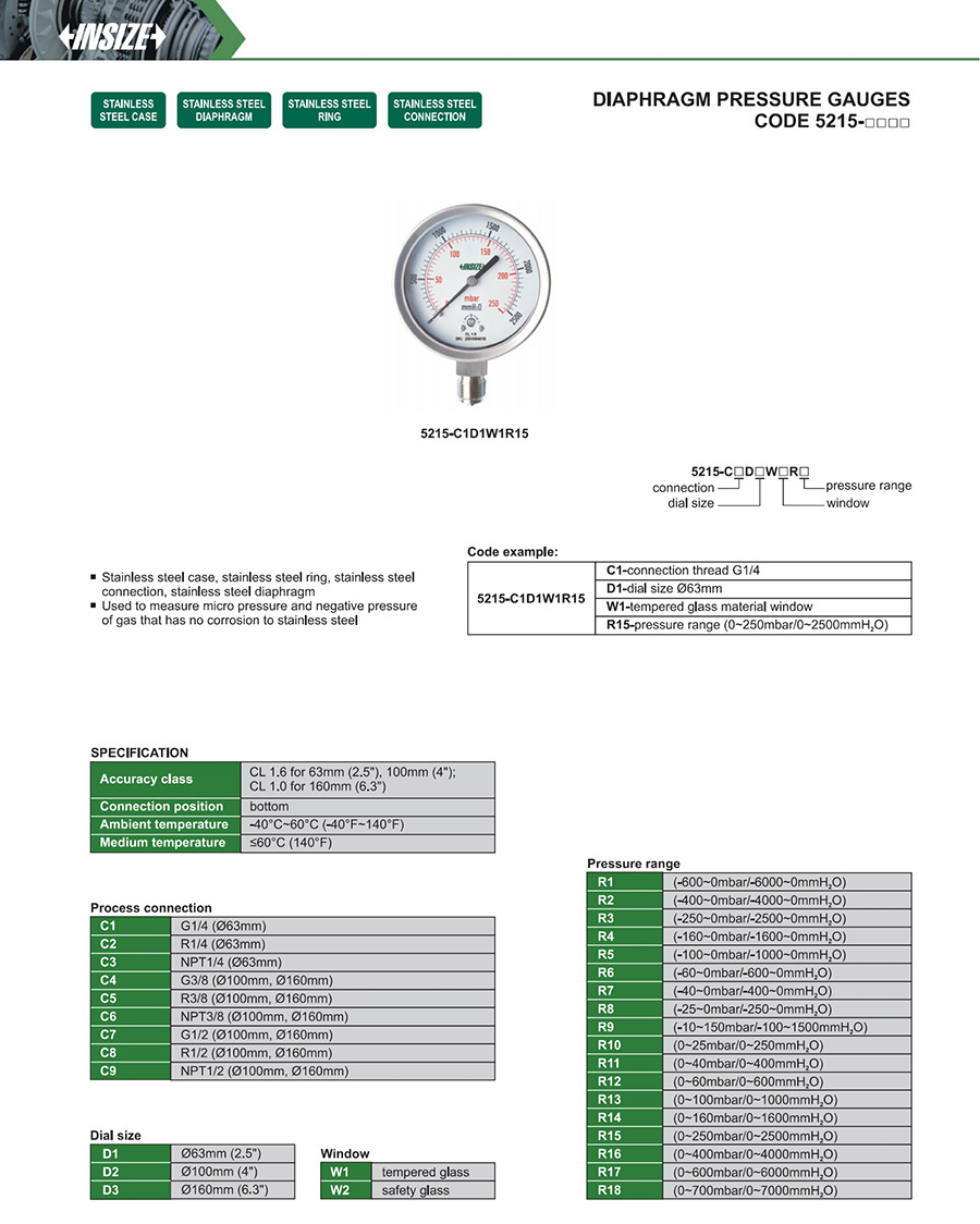 | 5215-□□□□ | G1/4, R1/4, NPT1/4, G3/8, R3/8, NPT3/8, G1/2, R1/2, NPT1/2 | Ø63mm, Ø100mm, Ø160mm | bottom | tempered glass, safety glass |