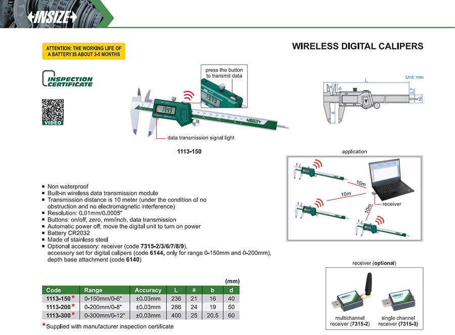 1113-150 0-150mm/0-6" ±0.03mm 0.01mm/0.0005" built-in wireless