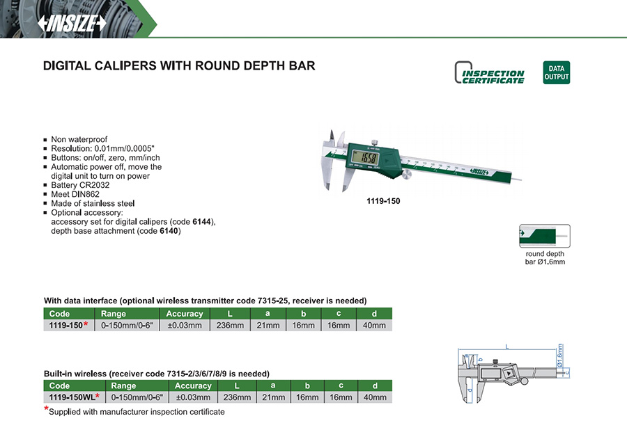 1119-150WL 0-150mm/0-6" ±0.03mm 0.01mm/0.0005" built-in wireless