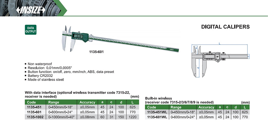 1135-601 0-600mm/0-24" ±0.05mm 0.01mm/0.0005" with data interface