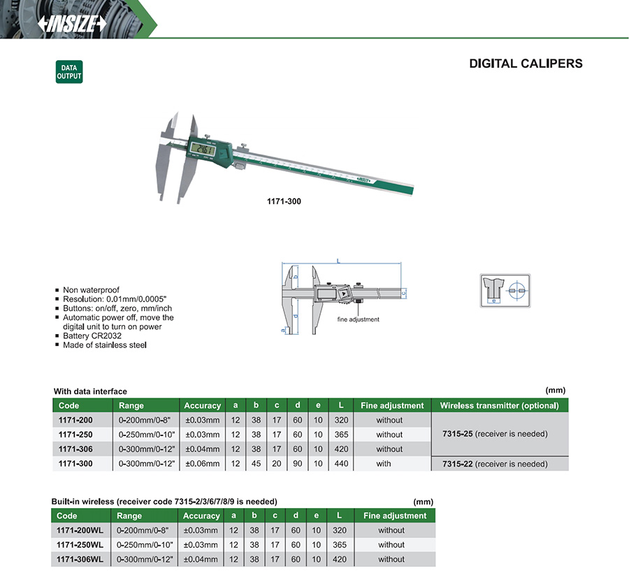 1171-306WL 0-300mm/0-12" ±0.04mm 0.01mm/0.0005" built-in wireless