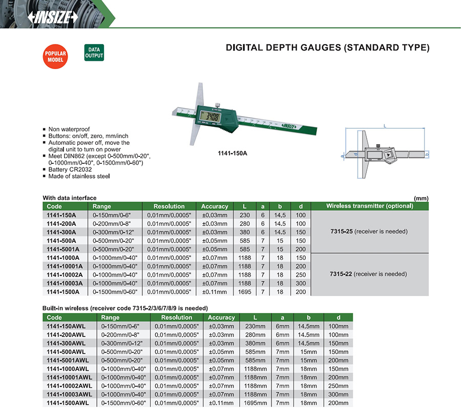 1141-1500A 0-1500mm/0-60" ±0.11mm 0.01mm/0.0005" with data interface