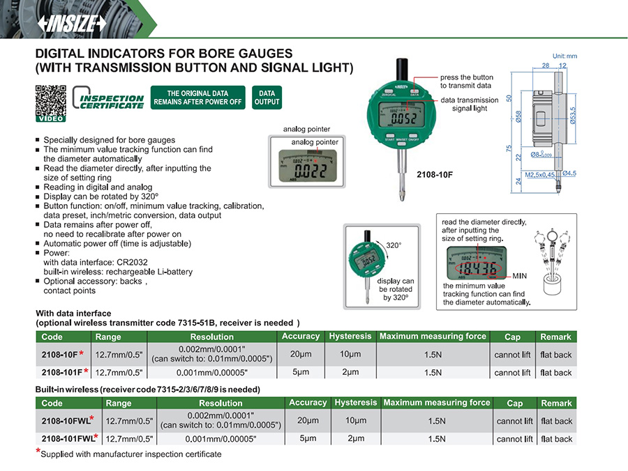 | 2108-101F | 12.7mm/0.5" | 5µm | 0.001mm/0.00005" |