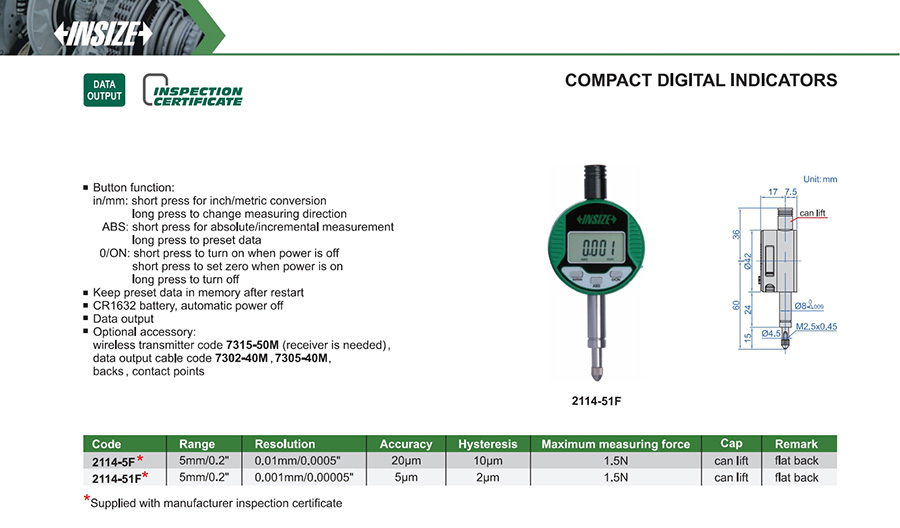 2114-51F 5mm/0.2" 5µm 0.001mm/0.00005"