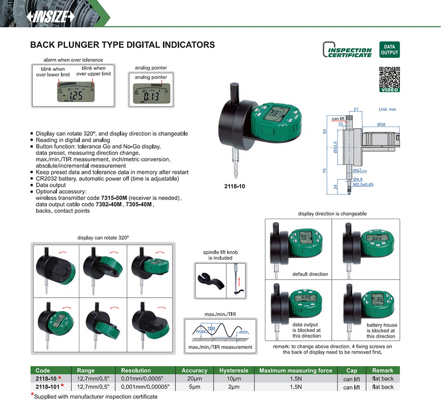 Button function: tolerance Go and No-Go display, data preset, measuring direction change, max./min./TIR measurement, inch/metric conversion,absolute/incremental measurement
