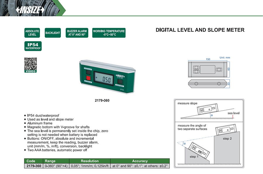 2179-360 0-360° (90°×4) at 0° and 90°: ±0.1°; at others: ±0.2° 0.05°; 1mm/m; 0.125in/ft no