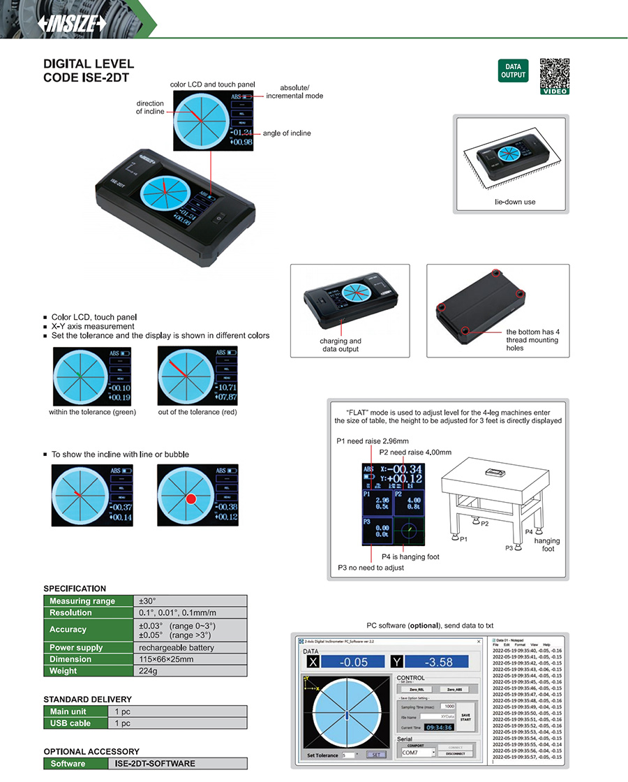 ISE-2DT ±30° ±0.03° (range 0~3°);±0.05° (range >3°) 0.1°, 0.01°, 0.1mm/m no