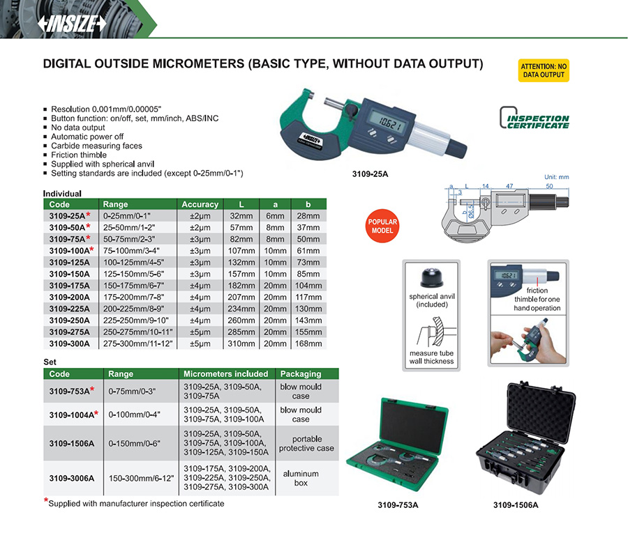 3109-25A 0-25mm/0-1" ±2μm 0.001mm/0.00005"