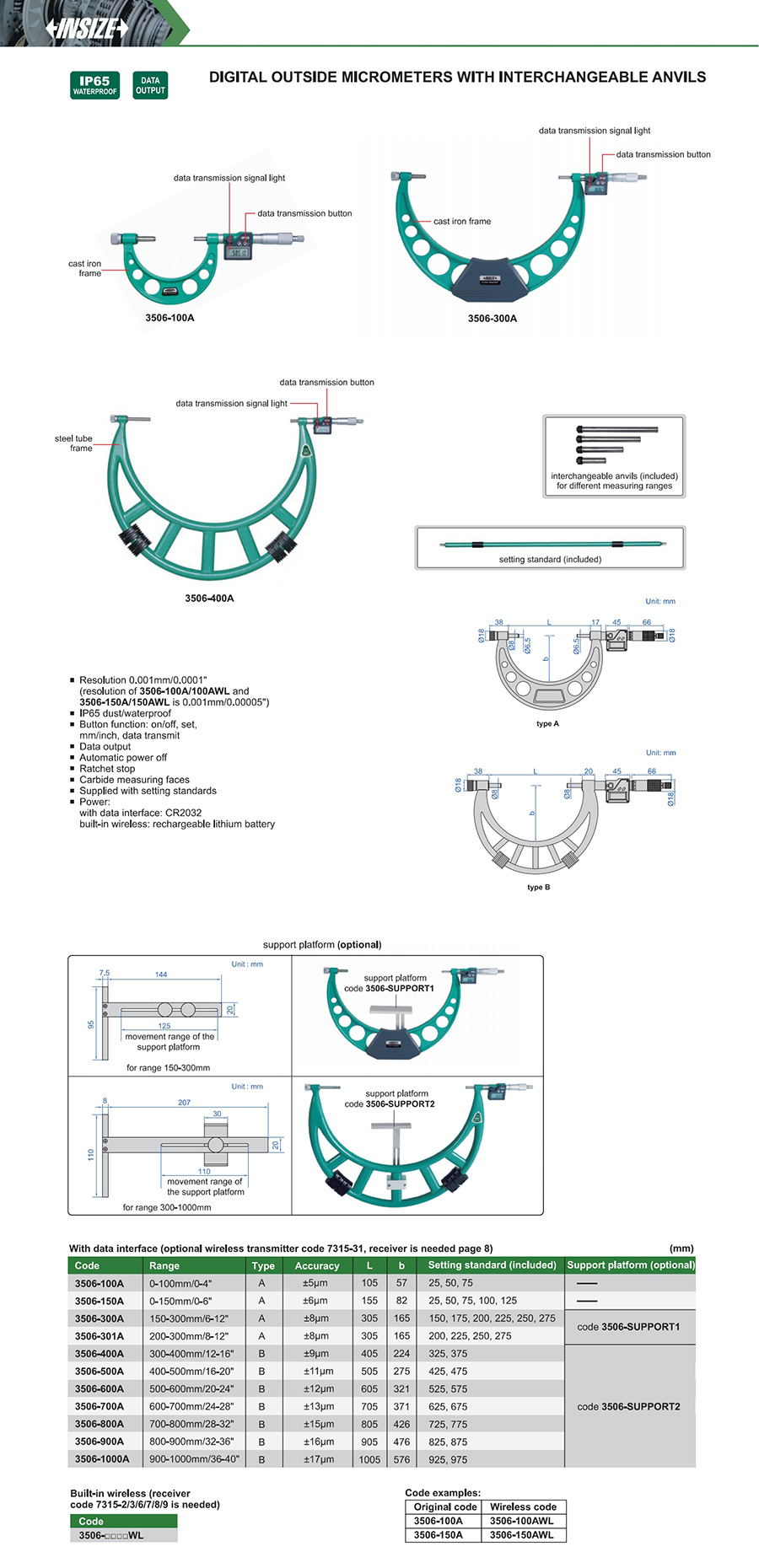 | 3506-301A | 200-300mm/8-12" | ±8μm | 0.001mm/0.0001" | with data interface |