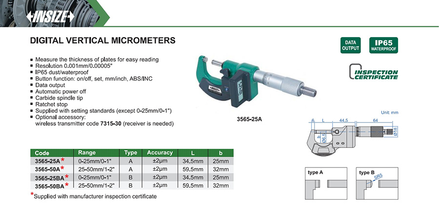 3565-25A A 0-25mm/0-1" ±2μm 0.001mm/0.00005"