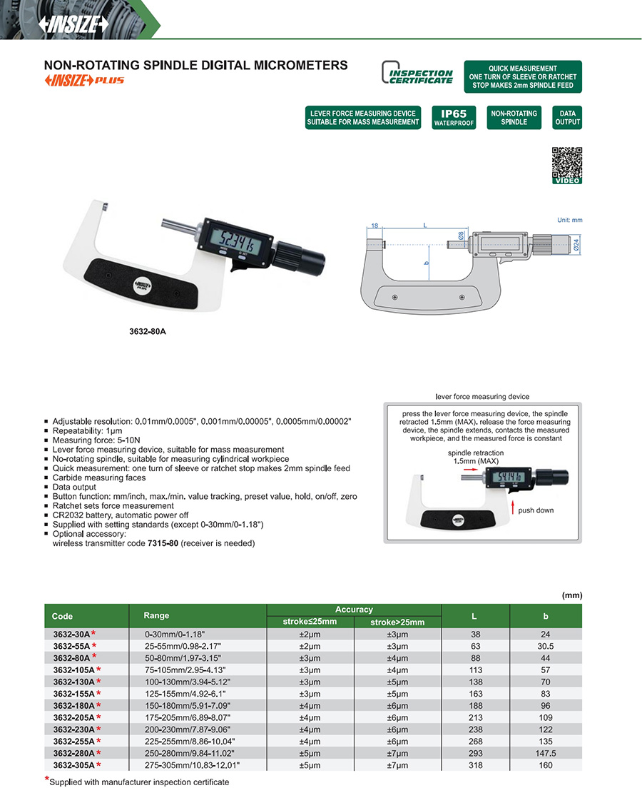 3632-30A 0-30mm/0-1.18" stroke≤25mm:±2μm, stroke>25mm:±3μm 0.01mm/0.0005", 0.001mm/0.00005", 0.0005mm/0.00002"