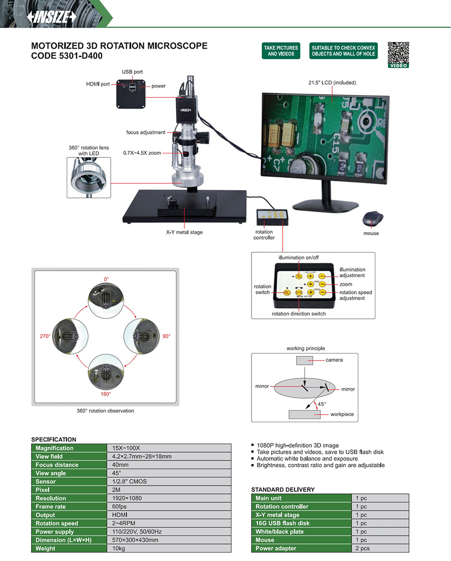 | 5301-D400 | 3D rotation microscopes | 15X~100X | 4.2×2.7mm~28×18mm | 2M |