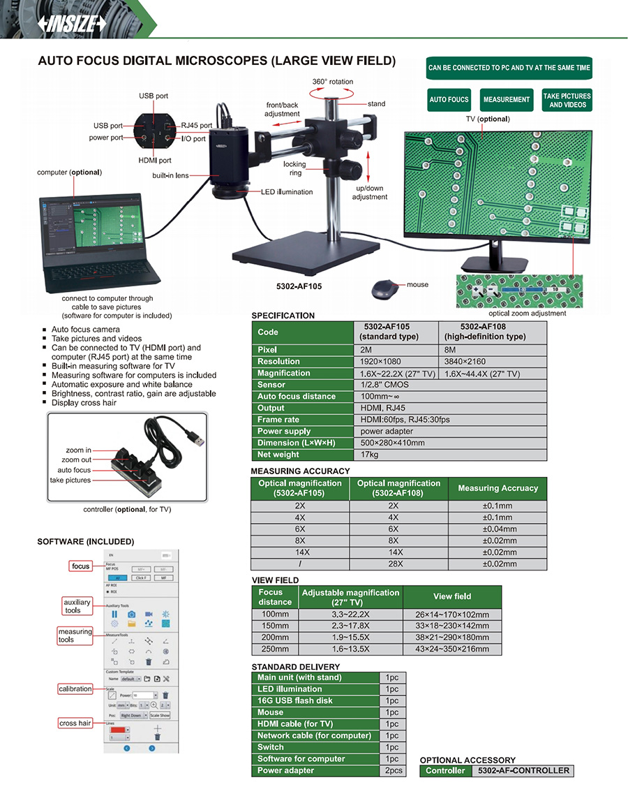 5302-AF108 auto focus digital microscopes 1.6X~22.2X (27" TV) 26×14~170×102mm, 33×18~230×142mm, 38×21~290×180mm, 43×24~350×216mm 8M
