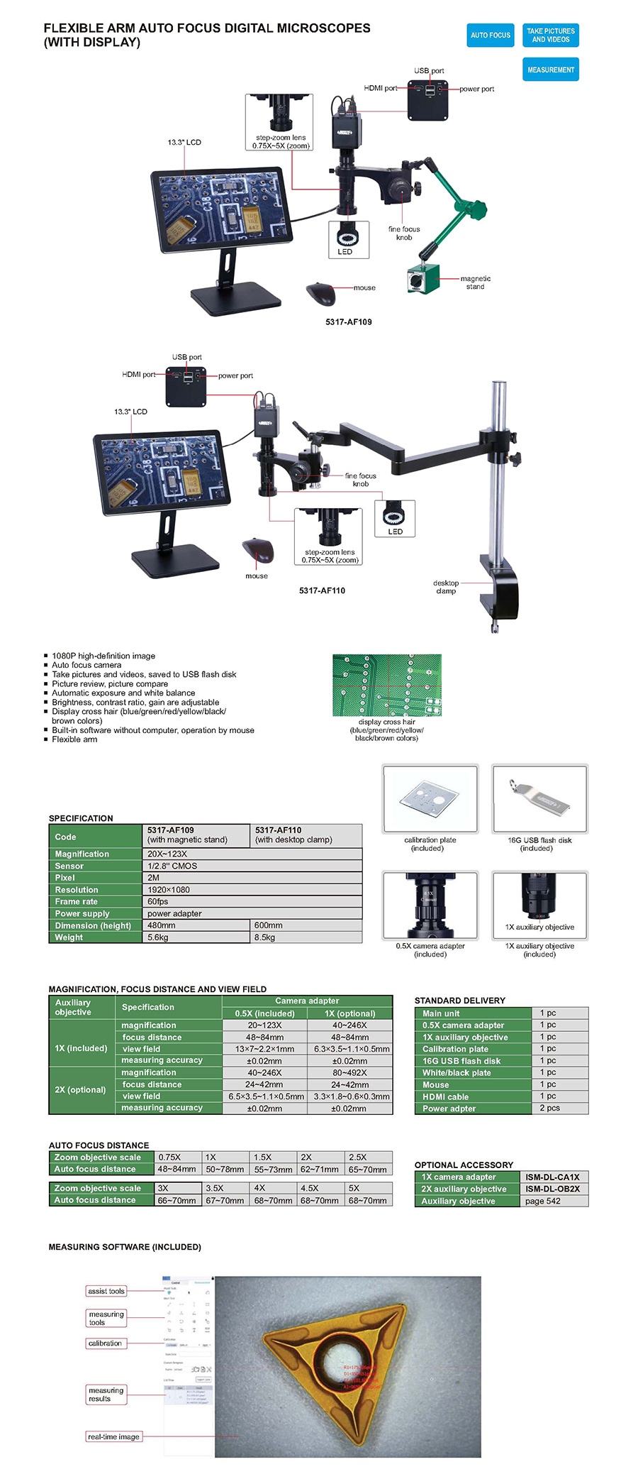 5317-AF110 auto focus digital microscopes 20X~123X 13×7~2.2×1mm, 6.3×3.5~1.1×0.5mm 2M