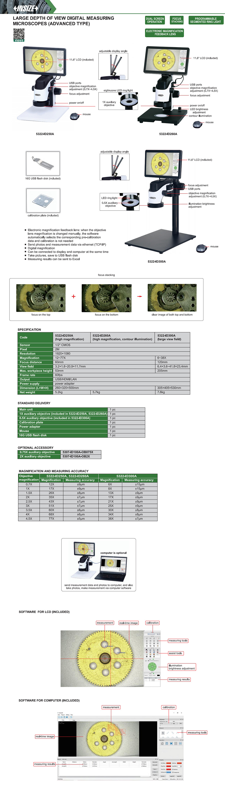 5322-ID300A digital measuring microscopes 6~38X 6.4×3.6~41.8×23.4mm 2M