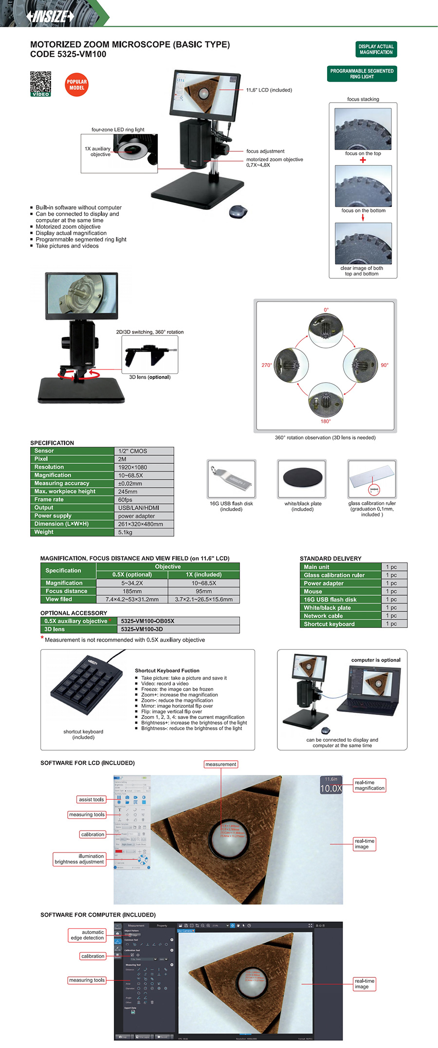 5325-VM100 digital measuring microscopes 10~68.5X 3.7×2.1~26.5×15.6mm 2M