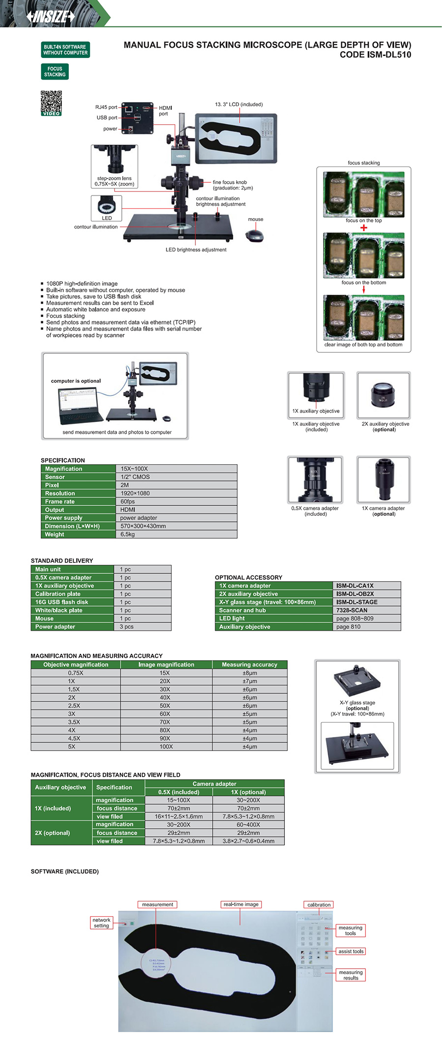 ISM-DL510 digital measuring microscopes 15X~100X 16×11~2.5×1.6mm, 7.8×5.3~1.2×0.8mm 2M