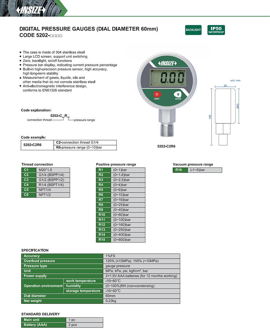 5202 1%FS M14, G1/4, NPT1/4 60mm
