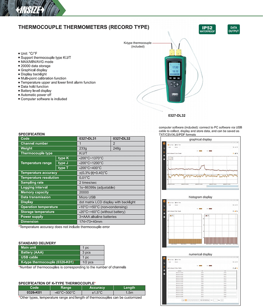 0327-DL32 K thermocouple ±(0.3%∙|t|+0.40)°C 2 yes -200°C~1370°C