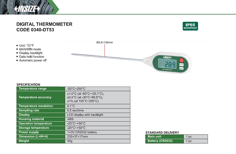 0340-DT53 thermistor ±1.0°C (at -50°C~-30.1°C), ±0.5°C (at -30°C~99.9°C), ±1% (at 100°C~250°C) -50°C~250°C