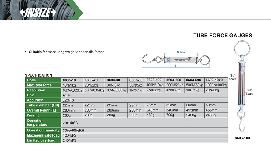 | 8603-500 | tube | 500N/50kg | 10N/1kg |