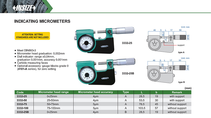 3332-100 A 75-100mm 0.002mm ±0.04mm 0.001mm