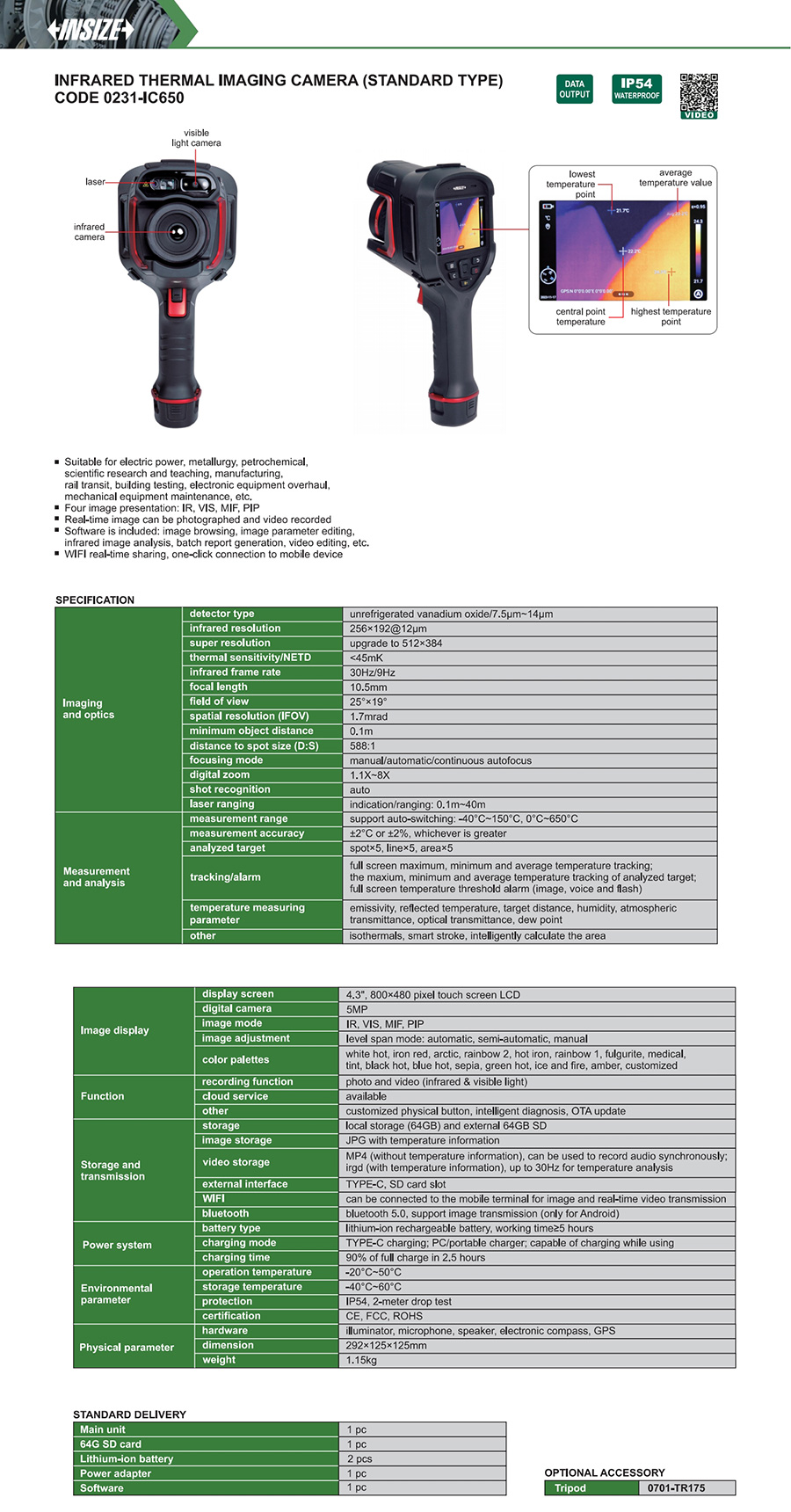 0231-IC650 support auto-switching: -40°C~150°C, 0°C~650°C 256×192@12μm manual/automatic/continuous autofocus yes