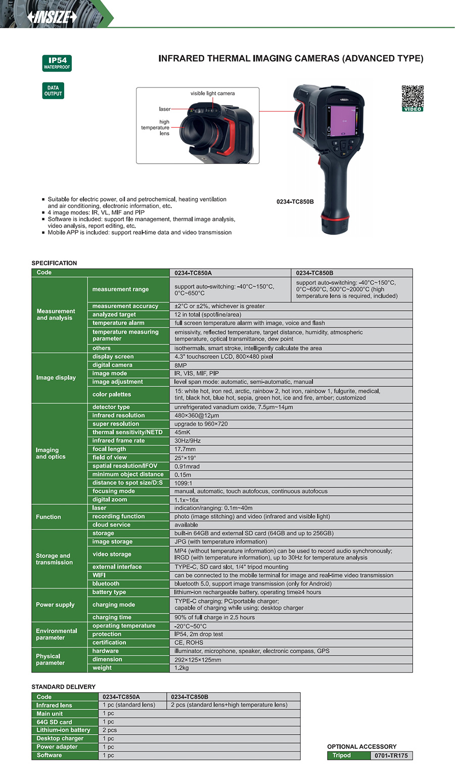 | 0234-TC850A | support auto-switching: -40°C~150°C, 0°C~650°C | 480×360@12µm | manual, automatic, touch autofocus, continuous autofocus | yes |