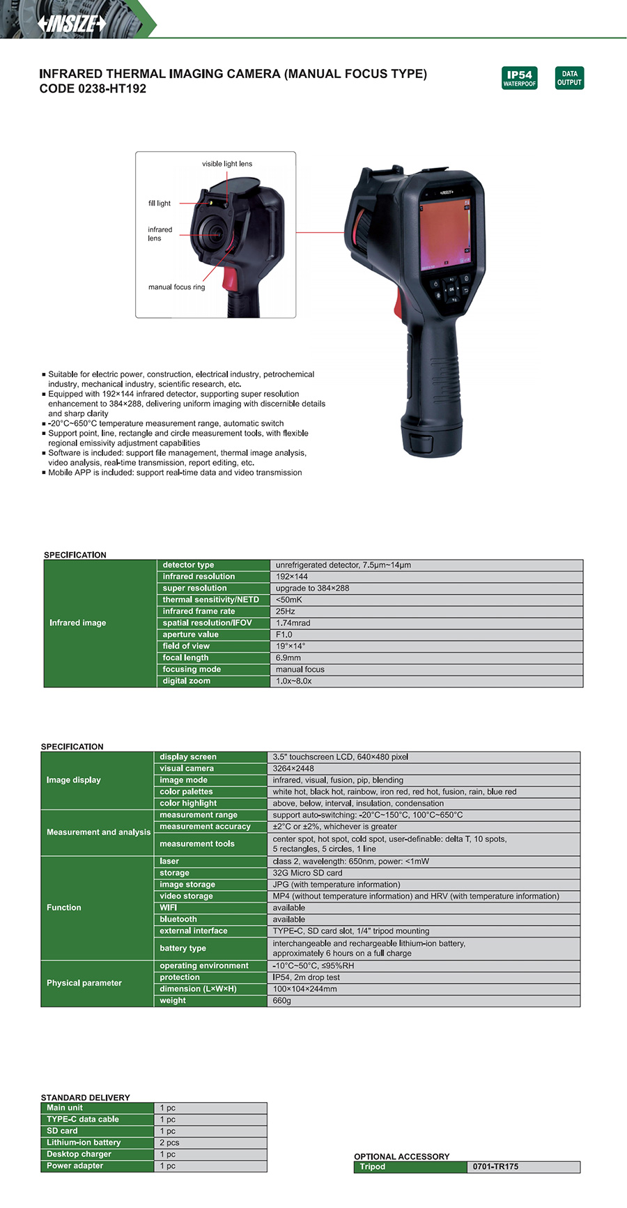 0238-HT192 support auto-switching:-20°C~150°C,100°C~650°C 192x144 manual focus yes