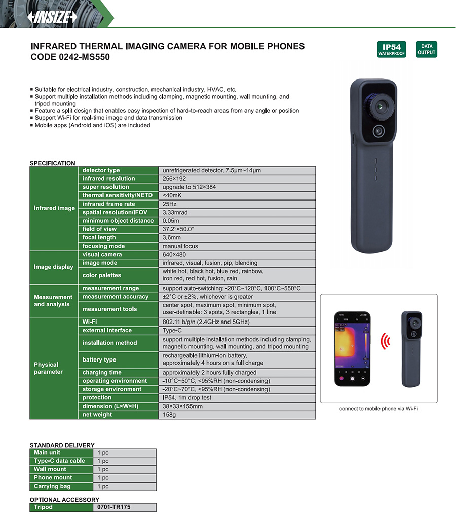 0242-MS550 support auto-switching: -20°C~120°C, 100°C~550°C 256×192 manual focus upgrade to 512×384