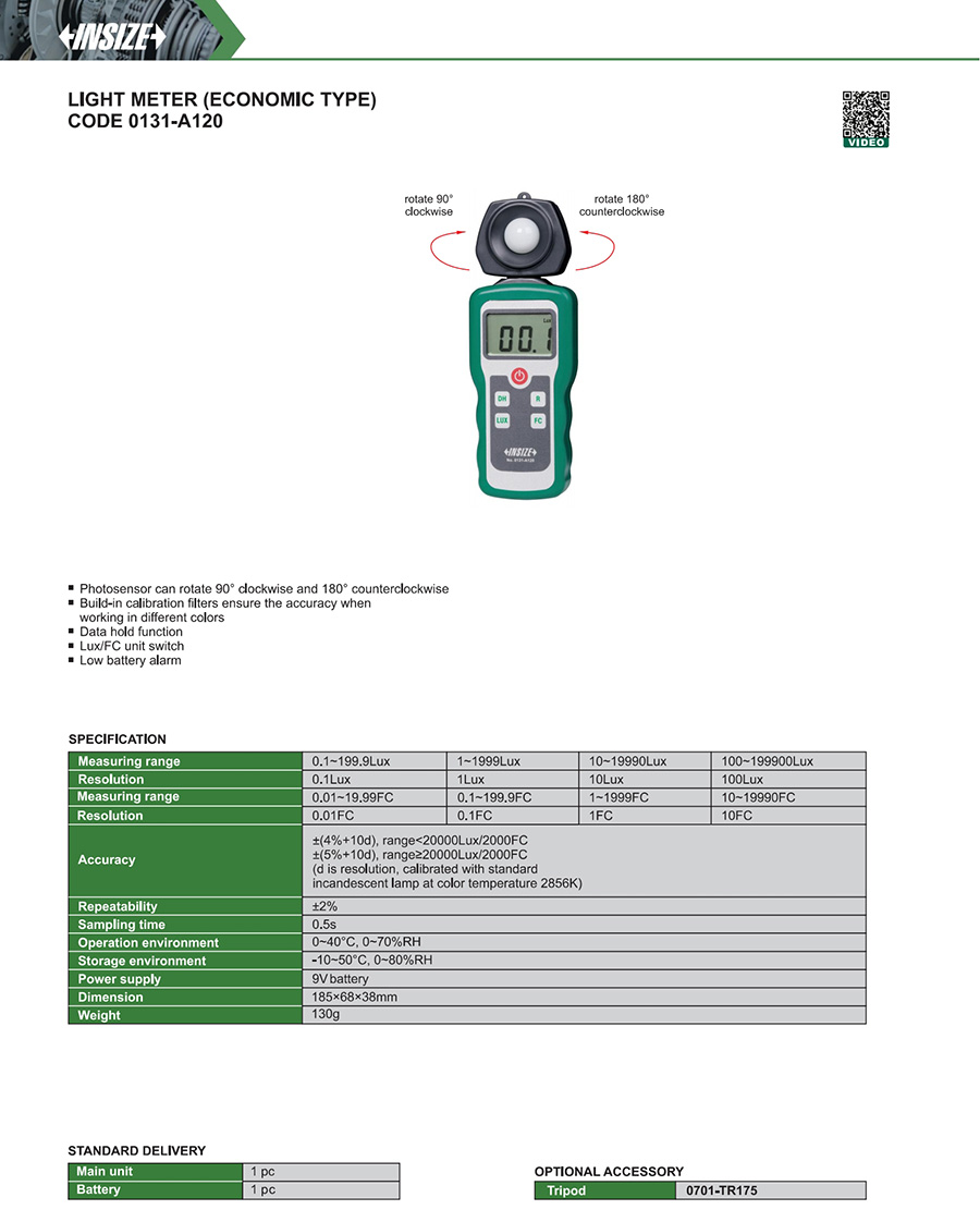 0131-A120 0.1~199900Lux/0.1~19990FC 0.1Lux/1Lux/10Lux/100Lux, 0.01FC/0.1FC/1FC/10FC
