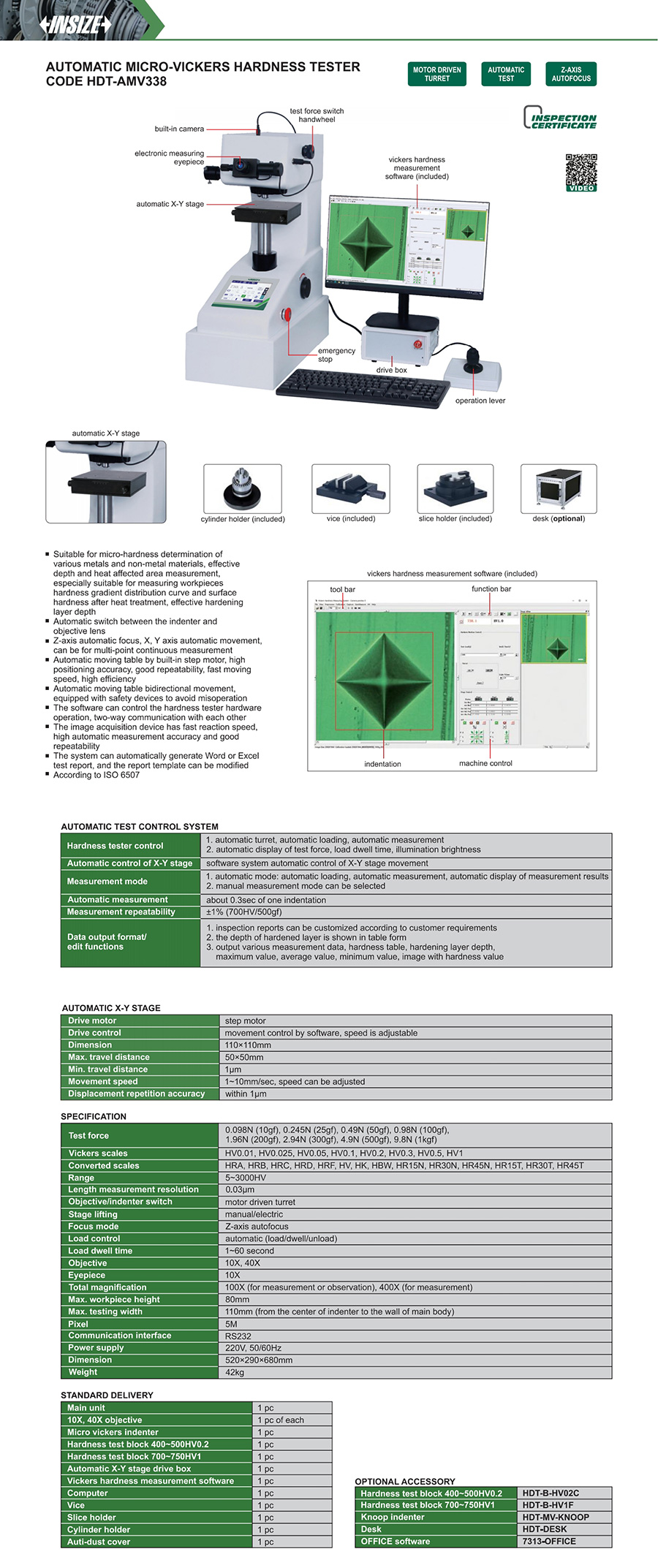 HDT-AMV338 automatic (load/dwell/unload) 80mm 110mm HV0.01~HV1 100X (for measurement or observation), 400X (for measurement)