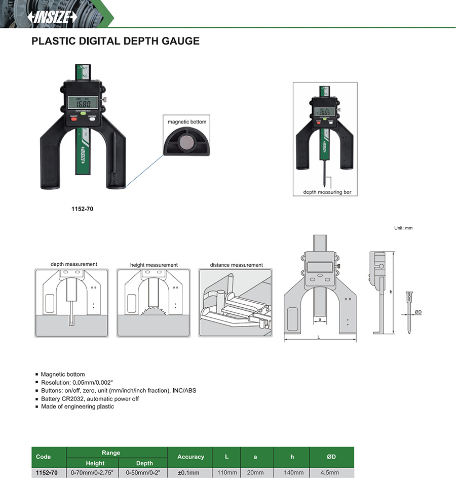 1152-70 height 0-70mm/0-2.75", depth 0-50mm/0-2" ±0.1mm 0.05mm/0.002"