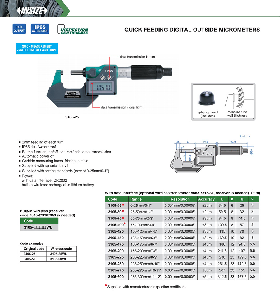3105-125WL 100-125mm/4-5" ±3µm 0.001mm/0.00005" built-in wireless