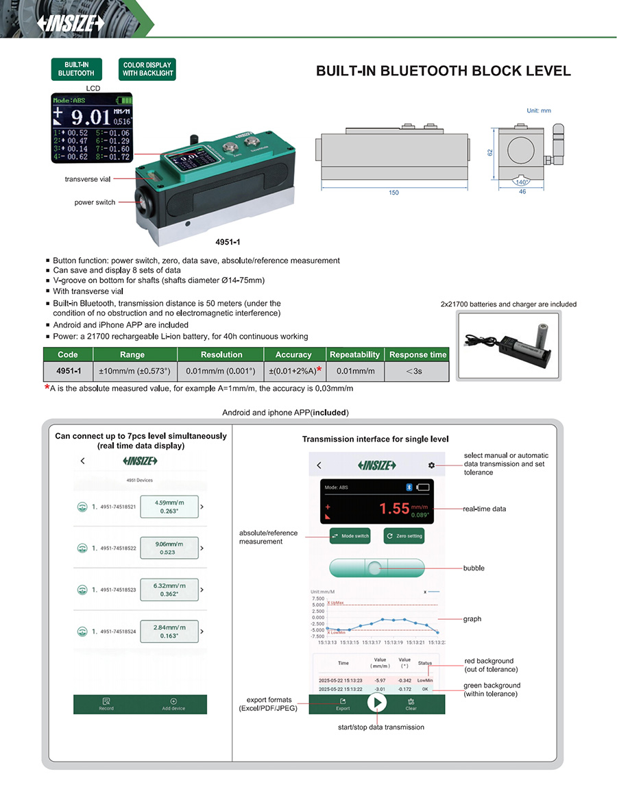 4951-1 ±10mm/m (±0.573°) ±(0.01+2%A) 0.01mm/m (0.001°)