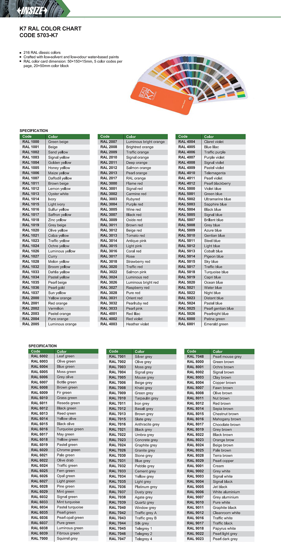 RAL color card dimension: 50×150×15mm, 5 color codes per page, 20×50mm color block