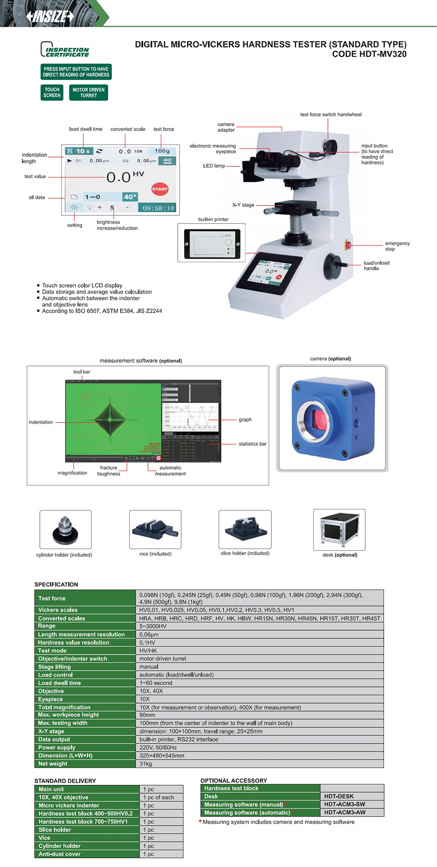 | HDT-MV320 | automatic (load/dwell/unload) | 90mm | 100mm | HV0.01, HV0.025, HV0.05, HV0.1, HV0.2, HV0.3, HV0.5, HV1 | 10X (for measurement or observation), 400X (for measurement) |