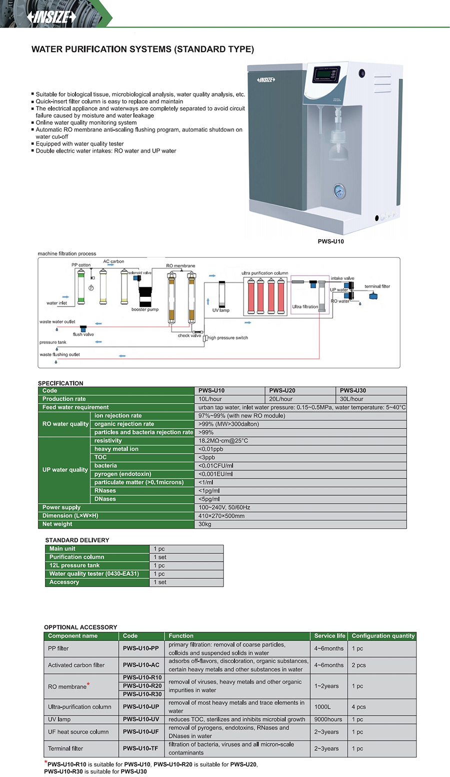 PWS-U30 organic rejection rate: >99% (MW>300dalton) particulate matter (>0.1microns): <1/ml 30L/hour